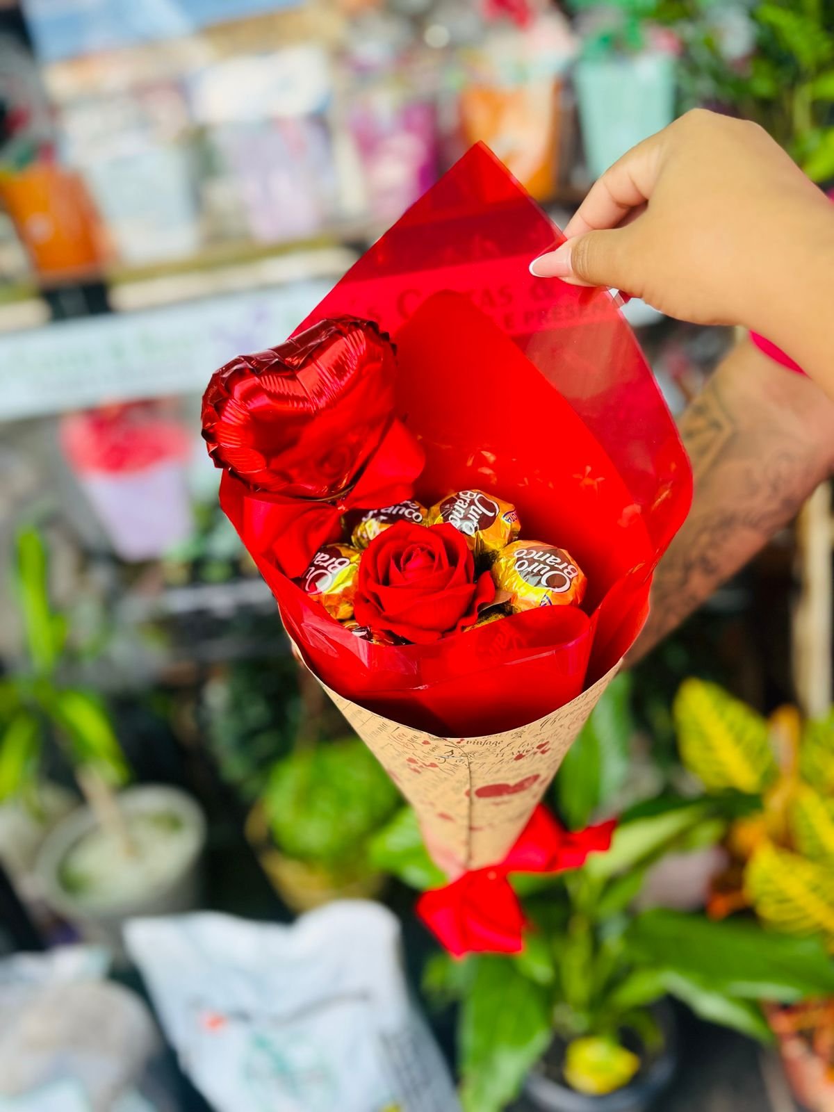 Um gesto clássico de afeto que combina beleza e sabor em perfeita harmonia. Este arranjo individual destaca a vivacidade de 1 rosa vermelha selecionada, simbolizando o carinho, acompanhada por uma deliciosa seleção de bombons. Finalizado com folhagens verdes e um laço de cetim artesanal, é a escolha ideal para surpreender em qualquer momento do dia, celebrar amizades ou expressar gratidão com muita doçura.