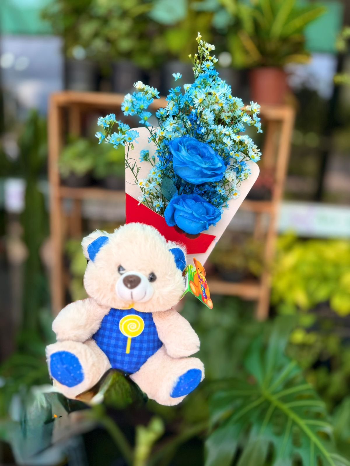 Ramalhete com duas rosas azuis acompanhado de ursinho de pelúcia, em uma composição delicada e cheia de significado.