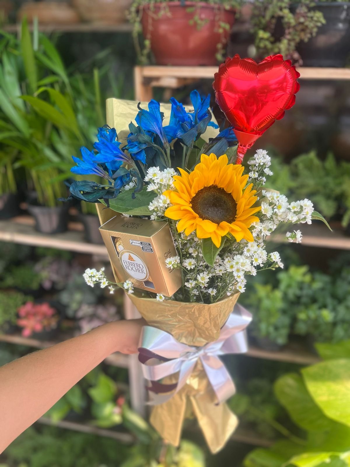 Uma combinação radiante desenhada para iluminar o dia de alguém especial. Este kit apresenta a energia vibrante de um girassol selecionado acompanhado pela sofisticação de uma caixa de Ferrero Rocher (4 unidades). Montado em uma base artesanal com acabamento em gipsófilas, é o presente ideal para expressar gratidão e carinho com elegância e brilho.