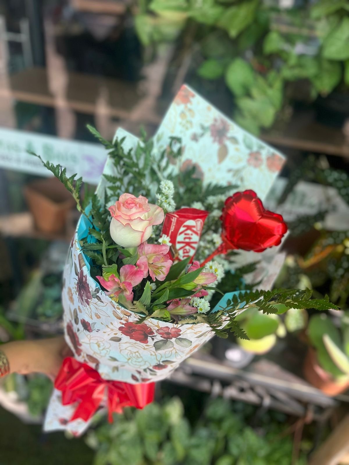 Um gesto de carinho simples, moderno e irresistível. Este arranjo individual destaca a beleza de 1 rosa vermelha selecionada, simbolizando o afeto, harmonizada com a crocância de um chocolate Kit-Kat. Finalizado com gipsófilas delicadas e um laço de cetim, é a escolha perfeita para surpreender em momentos espontâneos, celebrar pequenas conquistas ou simplesmente adoçar o dia de alguém especial.