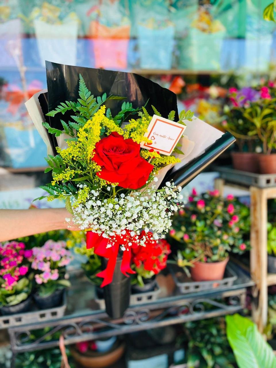 A sofisticação de um clássico em sua forma mais imponente. Este arranjo individual destaca a beleza de 1 rosa importada, reconhecida por seu botão grande, pétalas aveludadas e cor vermelha intensa. Apresentada em uma embalagem moderna com gipsófilas e um laço de cetim personalizado, é a escolha perfeita para expressar admiração e carinho com um toque de luxo e exclusividade.