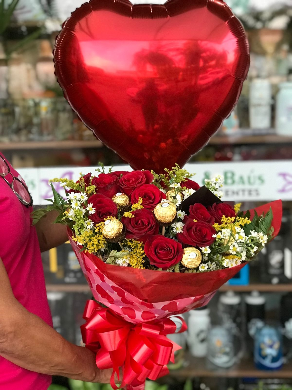 O encontro perfeito entre o romantismo e o luxo. Este buquê imponente reúne 12 rosas vermelhas selecionadas intercaladas com a sofisticação dos bombons Ferrero Rocher. Um presente de impacto máximo, finalizado com gipsófilas e embalagem luxuosa, desenhado para surpreender e encantar em grandes celebrações.