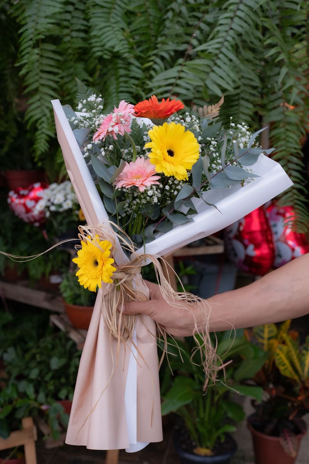 A vibração das cores em um arranjo que transborda vida e alegria. Este buquê combina gérberas em tons de rosa, amarelo e laranja, simbolizando pureza e energia positiva. Finalizado com folhagens selecionadas e embalagem em tons pastel, é a escolha ideal para iluminar o dia de alguém especial ou celebrar momentos festivos.