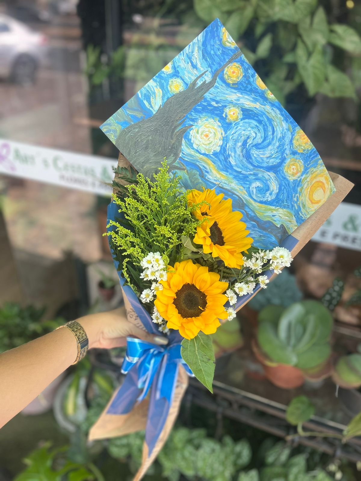 Uma homenagem à beleza e à genialidade de Van Gogh em forma de flores. Este buquê exclusivo combina a energia vibrante de 3 girassóis selecionados com uma papelaria temática inspirada na obra “A Noite Estrelada”. Finalizado com folhagens de tango, gipsófilas e um laço de cetim azul royal, é o presente ideal para mentes criativas e admiradores da arte que apreciam a luz e a cor em cada detalhe.