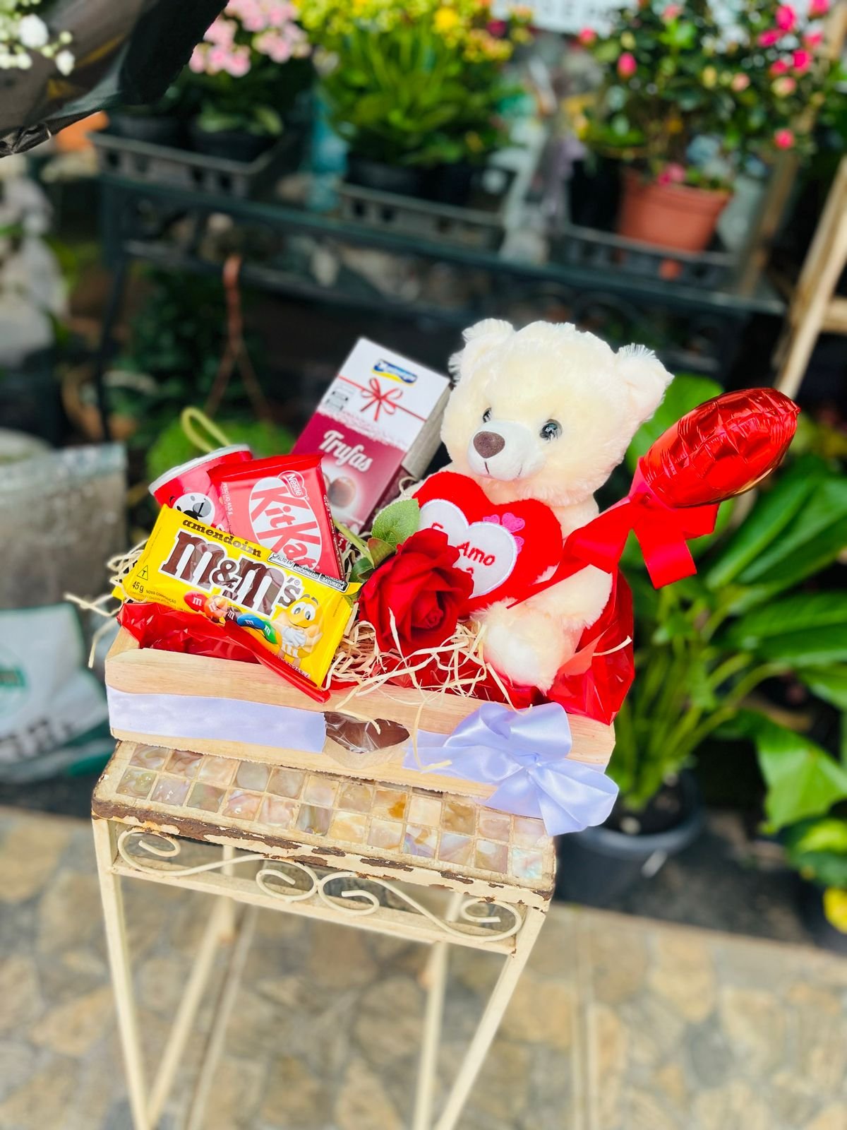 Essa cesta foi criado para expressar os sentimentos mais nobres com sofisticação. Combinamos a ternura do urso de pelúcia e o simbolismo da rosa vermelha com uma seleção irresistível de chocolates, como KitKat, M&M’s e trufas selecionadas. Finalizado com um balão metalizado de coração, é o presente perfeito para emocionar e marcar momentos especiais com o luxo que Brasília exige.