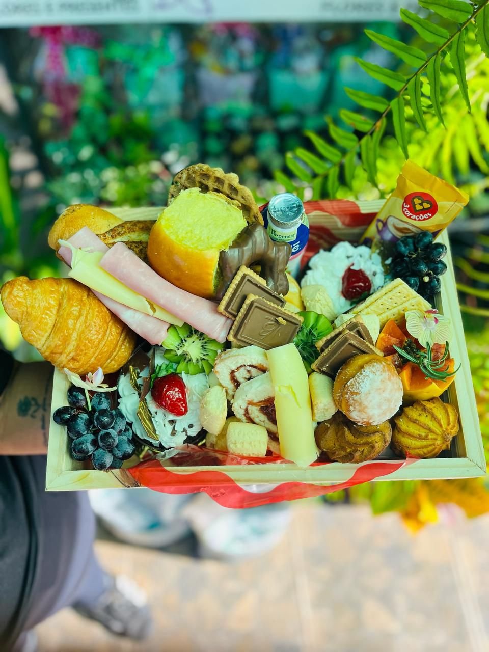 O produto se destaca pela variedade e fartura, misturando itens doces e salgados com uma apresentação visual bem colorida e apetitosa.