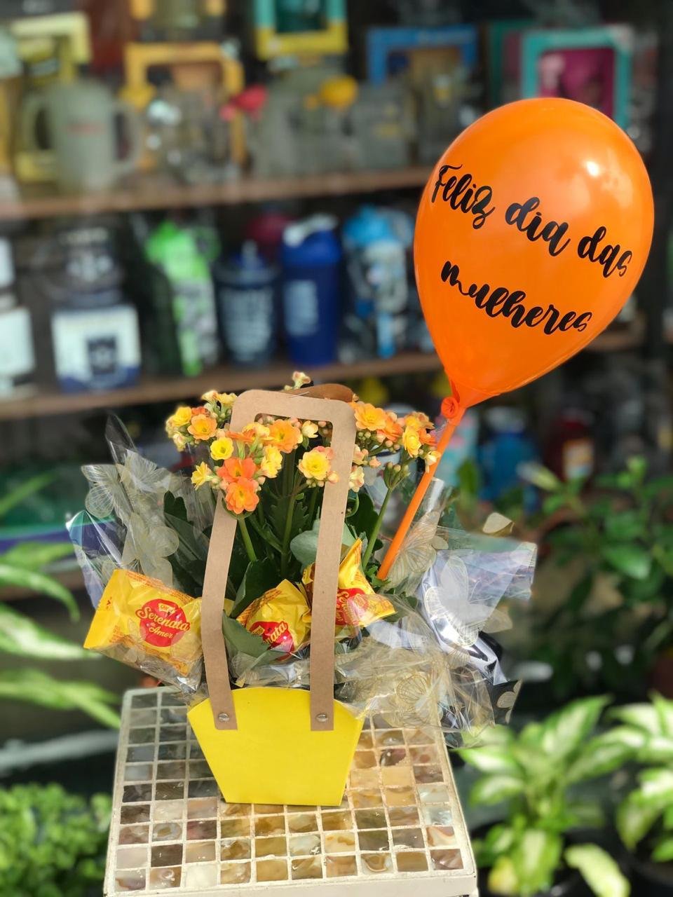 Kalanchoe na embalagem especial, acompanhada de balão “Feliz Dia das Mulheres” e três bombons delicadamente organizados.