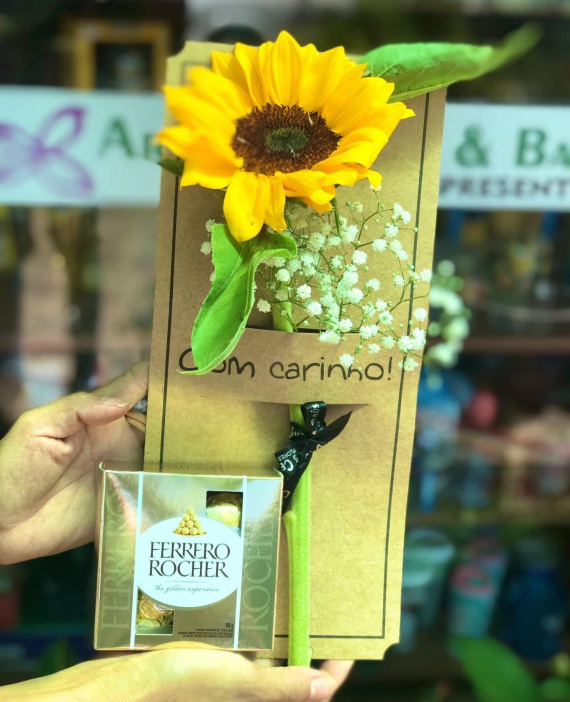 A combinação ideal para iluminar o dia de alguém especial. Este kit apresenta a beleza radiante de um Girassol selecionado, simbolizando lealdade e felicidade, acompanhado pelo toque de luxo de uma caixa de Ferrero Rocher (4 unidades). Uma escolha elegante e cheia de boas energias para presentear com classe.