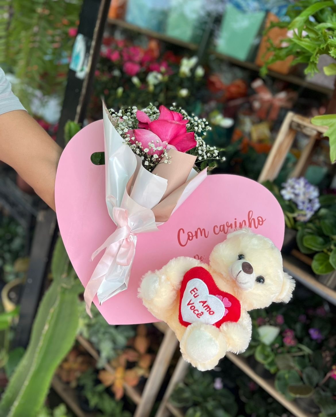 O máximo de carinho em um só presente. Este kit exclusivo apresenta uma base em formato de coração “Com Carinho”, acompanhada de um mini buquê de rosas pink envolto em gipsófilas e um ursinho de pelúcia super macio com a mensagem “Eu Amo Você”. É a escolha perfeita para emocionar e marcar presença no coração de alguém.