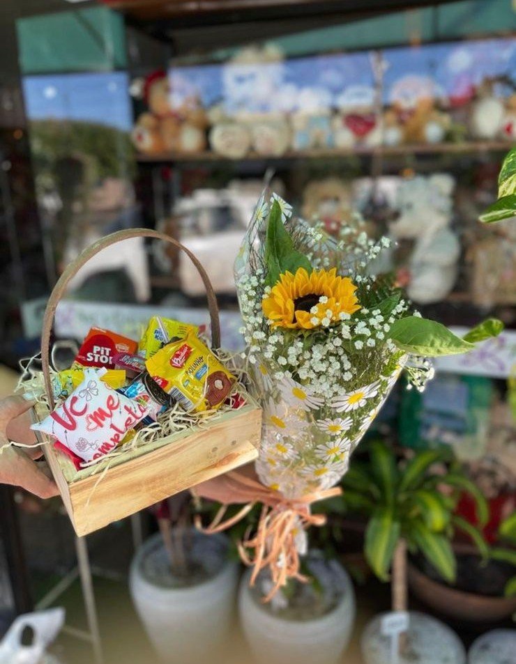 Este conjunto foi desenhado para quem deseja iluminar o dia de alguém especial em Brasília. Unimos o frescor de um buquê de girassol e gipsófilas à fofura de uma almofada temática “Vc me completa”, acompanhada por uma seleção afetiva de quitutes, como o bolinho Bauducco e snacks selecionados. Apresentado em um baú de madeira rústica com alça artesanal, é o presente perfeito para celebrar a vida e a amizade com sofisticação e muita luz.
