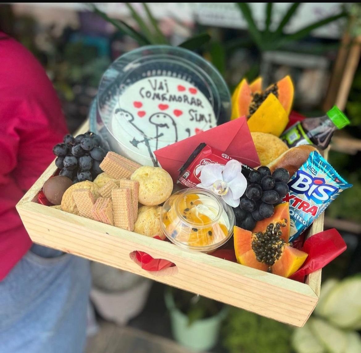 Este baú é um verdadeiro convite ao sorriso. Unimos a fofura do Bentô Cake personalizado com mensagens de carinho à leveza das frutas fresquinhas, como uvas e mamão, criando um equilíbrio perfeito entre doçura e frescor. Cada item, dos pães de queijo quentinhos às mousses cremosas, foi escolhido para transmitir cuidado em cada detalhe. É a escolha perfeita para dizer “estou a pensar em ti” com toda a doçura e ternura que o momento merece.